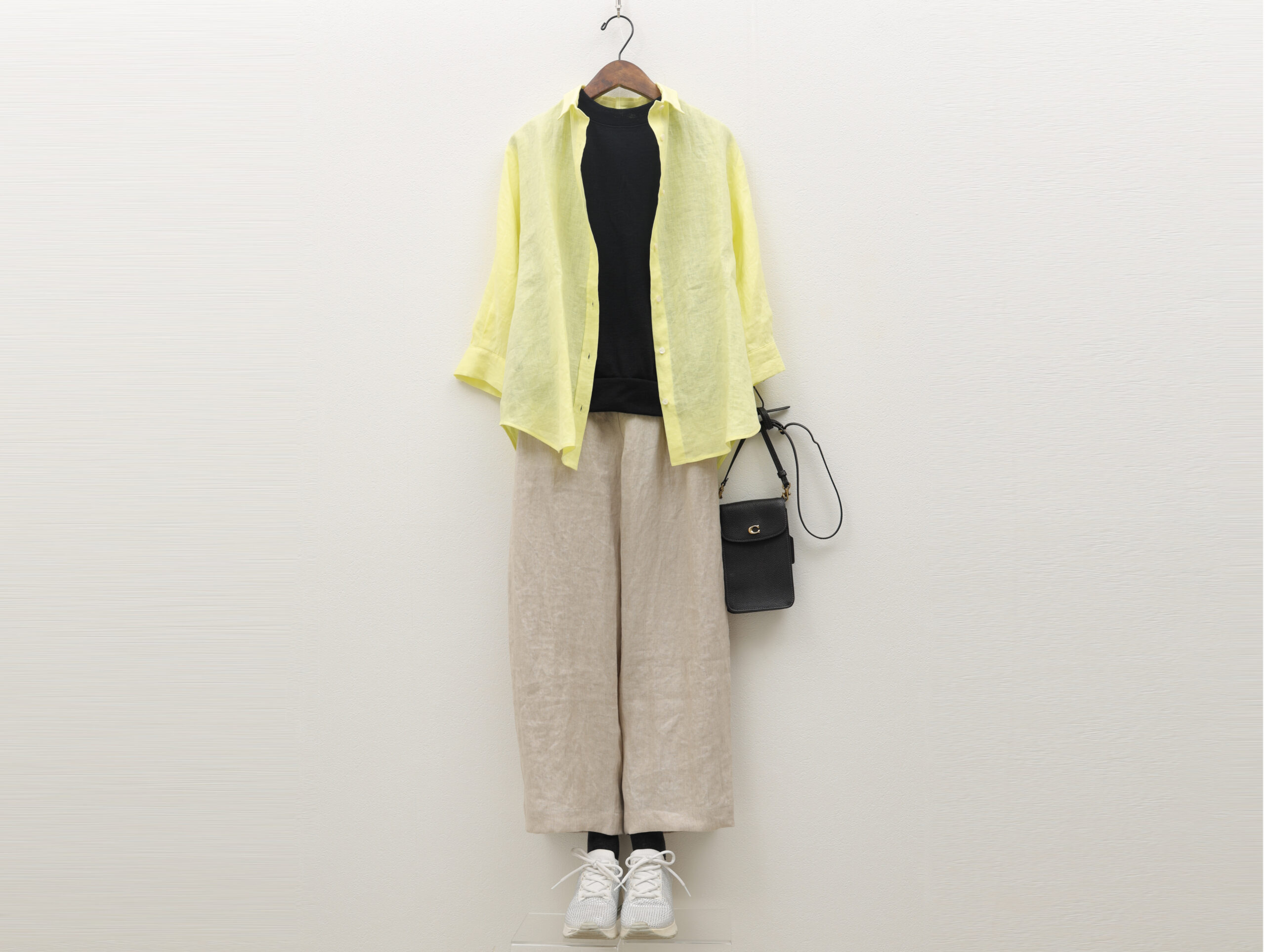 生成り色のリネンのワイドパンツに黒のコットンベストを合わせたリラックス感あるちょっぴりモードな着こなしに、イエローのシャツが目を惹く爽やかな組み合わせ。明るい色を取り入れると気分も上がります。さっそうとお出かけしたくなるコーデです。