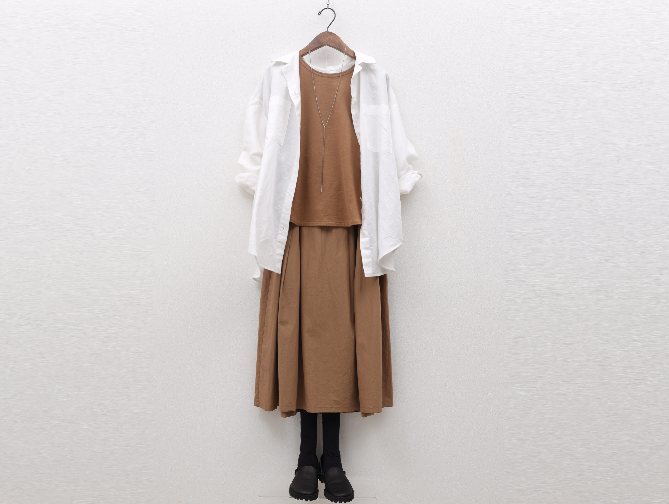 こっくりとしたキャラメルブラウンの上下が上品で落ち着いた印象ながら、ざっくりとジャケットのように羽織った白シャツが軽やかで、ゆったりと柔らかな雰囲気です。足元は黒で全身をキュッと引き締めました。少しきちんとしたい場面にもぴったりのコーデです。