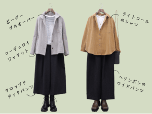 コーデAと同じヘリンボン生地のコートですが、こちらはフード付きということもあってより気軽でカジュアル。可憐さも感じるショート丈にクロップドパンツとショートブーツが似合います。全体をダークトーンでまとめた装いは、カジュアル・シックなお出かけスタイルになりました。