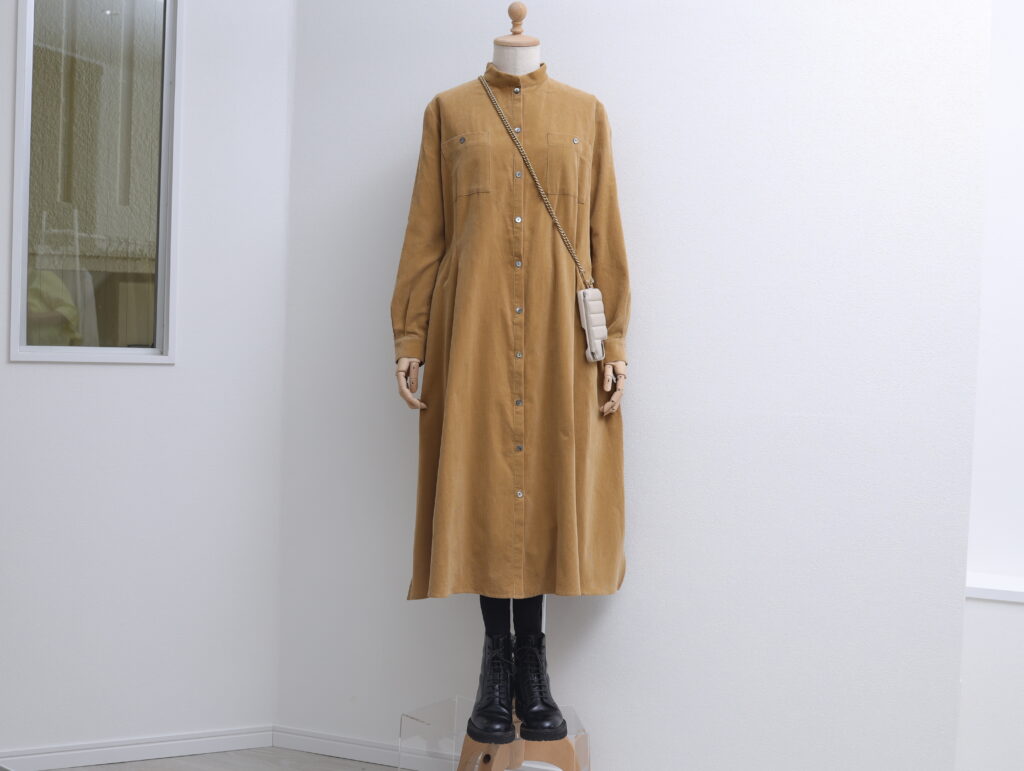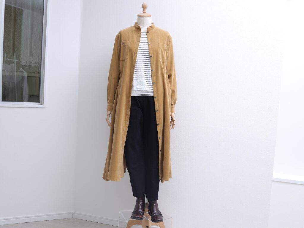 モノクロコーデも、温か色の細畝コーデュロイ・ワンピースをふんわり羽織れば、それだけで落ち着いた雰囲気に。ブーツを合わせてると気分はすっかり秋ですね。