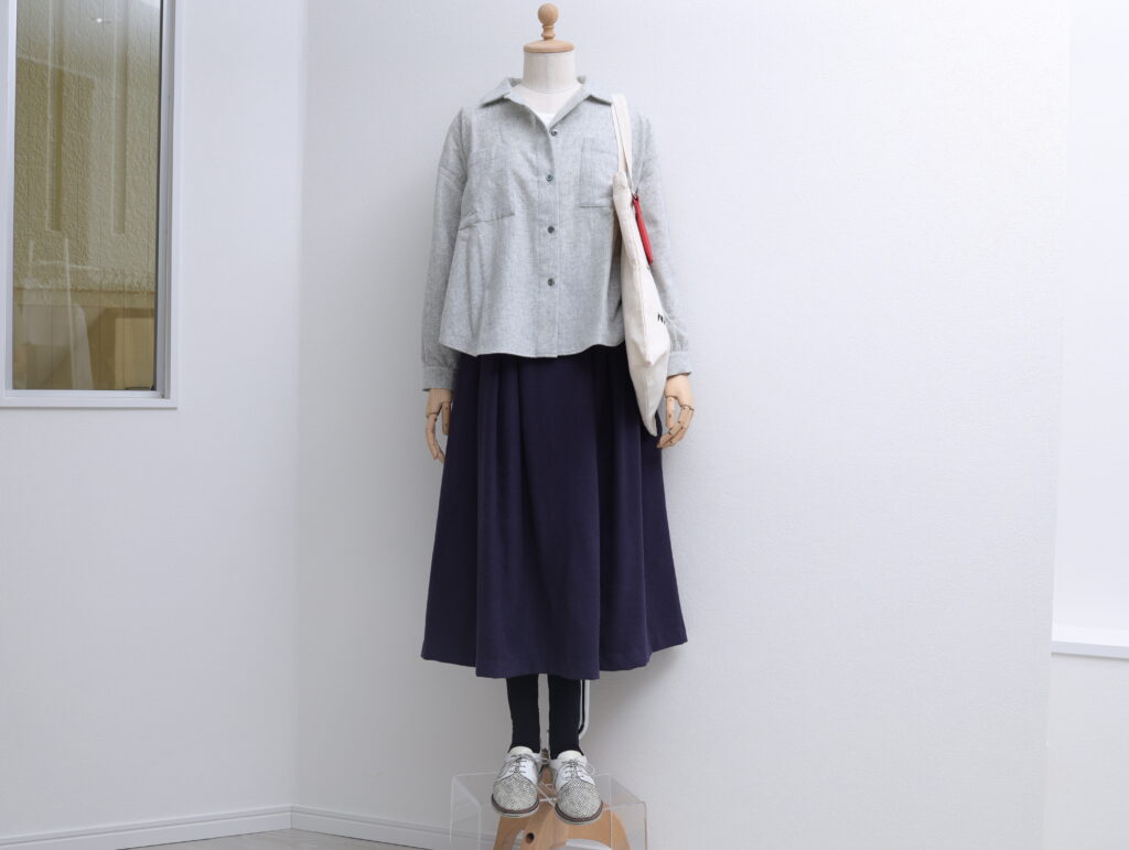 ウールのスカートは動くたびにエレガントに揺れて、シャツを合わせるだけで上品に決まります。布トートでカジュアルに気軽に楽しむのもアリかも。