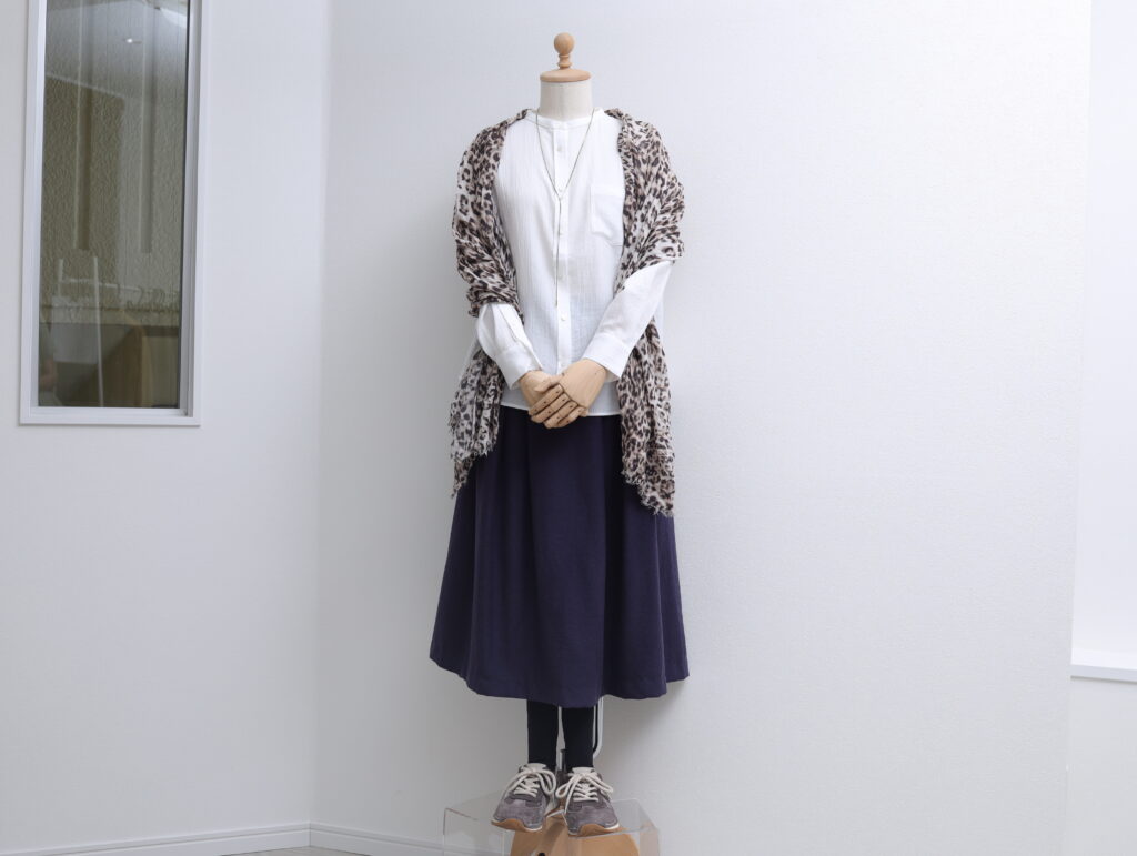 白のシャツにドレープが美しいネイビーのスカートを合わせた女性らしいスタイル+ストールを羽織ってエレガントに。ゆっくり美術展やギャラリー巡りはいかがでしょうか?