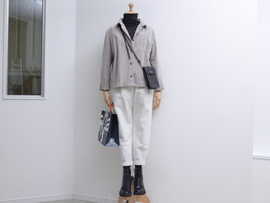 ほんのりマニッシュなモノトーンコーデをニュアンスカラーのコーデュロイジャケットで柔らかくまとめました。すっきりクリーンなスタイルはオン・オフを選ばず活用できます。